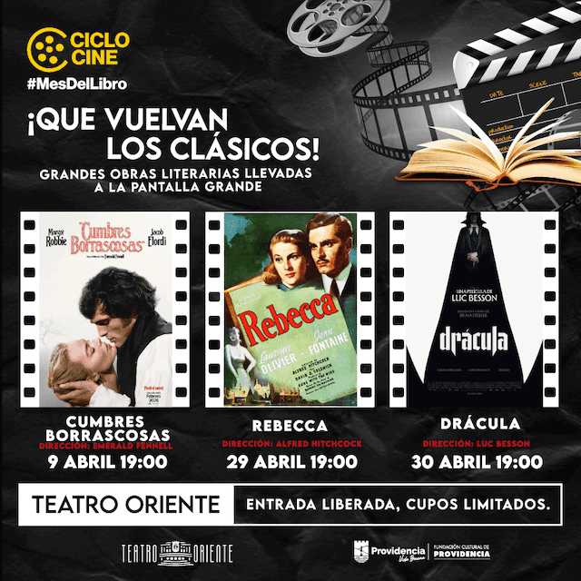 La Fundación Cultural de Providencia organizó un nuevo ciclo de cine esta vez literario para celebrar el Mes del Libro que se denomina “¡Que vuelvan los clásicos! Grandes obras literarias llevadas a la pantalla grande”. Jueves 9 abril / 19:00 hrs. CUMBRES BORRASCOSAS Drama-romance, dirigida por Emerald Fennell. +14, 136 min, Reino Unido. Protagonistas: Margot Robbie, Jacob Elordi, Hong Chau. Sinopsis: ésta es una nueva adaptación de la novela homónima de 1847 de Emily Brontë. La historia sigue a Heathcliff, un hombre consumido por el rencor tras ser rechazado por su amor de juventud, quien eligió casarse con un hombre rico. Su deseo de venganza lo llevará a desatar una tormenta de odio y sufrimiento sobre la familia de la mujer que lo traicionó, en un relato de pasión, obsesión y destrucci