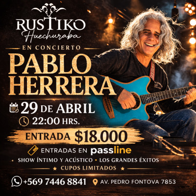 El concierto de Pablo Herrera en Rustiko Huechuraba promete ser una noche llena de energía y buena música en un ambiente íntimo y acogedor. Este evento, que se realiza en el reconocido Rustiko Huechuraba, ubicado en la Avenida Pedro Fontova, ofrecerá a los asistentes la oportunidad de disfrutar en vivo del talento del artista, quien ha ganado reconocimiento en la escena local por su estilo único y su capacidad para conectar con el público. La velada comenzará a las 21:00 horas con las puertas abiertas, permitiendo a los asistentes acomodarse y prepararse para una noche memorable. A las 22:00 horas, dará inicio el show, que seguramente estará lleno de sorpresas y momentos destacados. La entrada tiene un valor de 15.000 pesos chilenos, aunque en la descripción se menciona un precio diferente, lo que puede indicar diferentes opciones o promociones. La experiencia en este concierto será una oportunidad para escuchar en vivo las canciones que han consolidado la carrera de Pablo Herrera, además de disfrutar del ambiente vibrante y la buena compañía. Rustiko Huechuraba es conocido por su ambiente cálido y su excelente acústica, ideal para conciertos de este tipo. La noche promete ser un evento imperdible para los amantes de la música en vivo y para quienes desean vivir una experiencia auténtica en un espacio que combina buena música, buen ambiente y una propuesta artística de calidad.