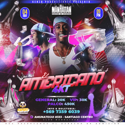 El evento titulado "EL AMERICANO 4KT EN CHILE" promete ser una noche llena de energía y ritmo en el emblemático Club Manhatan de Santiago. Este concierto reúne a uno de los artistas más destacados en la escena urbana, conocido por su estilo único y su capacidad para fusionar géneros musicales, creando un sonido fresco y vibrante que ha conquistado a una amplia audiencia. La experiencia en este evento será inolvidable, ya que los asistentes podrán disfrutar de una puesta en escena dinámica, con un ambiente cargado de entusiasmo y pasión por la música. La trayectoria del artista, que ha logrado consolidarse como uno de los referentes del género, garantiza una noche llena de buena música y momentos memorables. La ambientación del club, combinada con la energía del público, promete crear una atmósfera íntima y electrizante. Este concierto es una oportunidad imperdible para los fanáticos del género urbano y para quienes buscan vivir una noche de fiesta y música en vivo en Santiago. La producción ha preparado un espectáculo que combina luces, sonido y la presencia carismática del artista, asegurando una experiencia completa y emocionante para todos los asistentes.