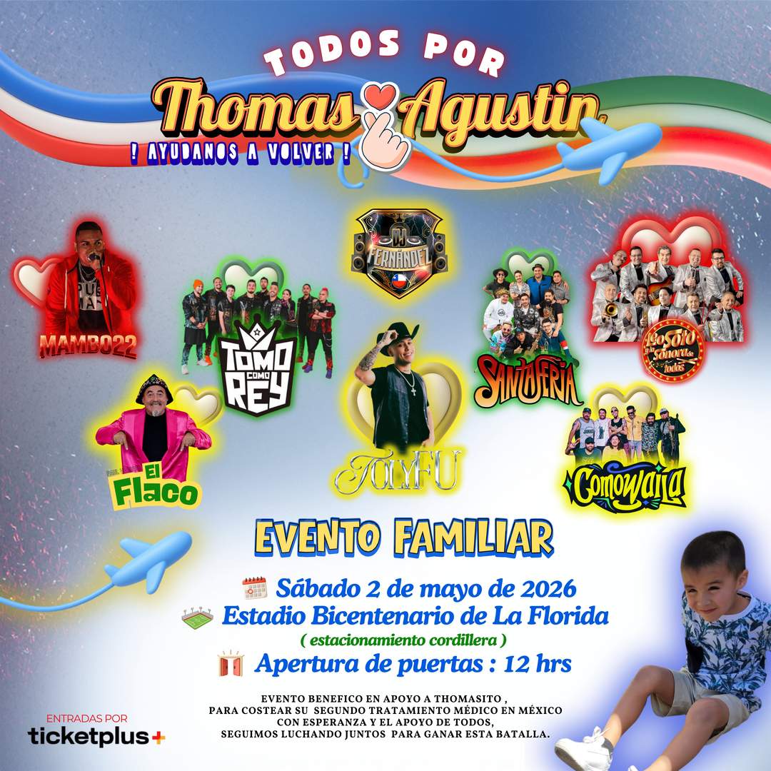 El evento "Todos Por Thomas Agustin" en el Estadio Bicentenario de La Florida es una iniciativa solidaria que busca reunir a la comunidad en una jornada de apoyo y esperanza. Este evento, que combina música, actividades recreativas y la participación de artistas locales, tiene como objetivo principal recaudar fondos para una causa benéfica relacionada con Thomas Agustin. La jornada está pensada para toda la familia, ofreciendo un ambiente seguro y amigable, con espacios para niños y adultos por igual. La presencia de artistas y grupos locales aporta un toque de cultura y entretenimiento, creando un espacio de unión y solidaridad. La infraestructura del estadio permite una gran convocatoria, facilitando la participación de muchas personas en una causa que trasciende lo meramente artístico. La experiencia promete ser emotiva y llena de energía positiva, invitando a todos a sumarse a esta causa noble. La iniciativa refleja el espíritu comunitario y la importancia de apoyar a quienes más lo necesitan, haciendo de este evento una oportunidad para disfrutar, colaborar y hacer la diferencia en la vida de alguien más.