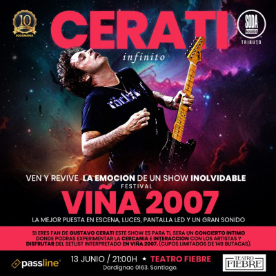 El tributo a Gustavo Cerati en Viña es una oportunidad única para revivir la magia del icónico cantante argentino, uno de los artistas más influyentes del rock en español. Este evento, que se realiza en el Teatro Fiebre de Providencia, promete una noche llena de nostalgia y emoción, donde bandas y músicos rendirán homenaje a la carrera del exintegrante de Soda Stereo. La experiencia busca transportar a los asistentes a los años dorados del rock latino, con interpretaciones que capturan la esencia y sensibilidad de Cerati. La atmósfera será íntima y vibrante, ideal para los fanáticos que desean celebrar su legado musical. La propuesta combina talento local y quizás invitados especiales, creando un ambiente de celebración y respeto por la música. La puesta en escena estará cuidadosamente diseñada para ofrecer un espectáculo memorable, con una selección de canciones emblemáticas que marcaron época. La noche será un recorrido por la trayectoria del artista, desde sus inicios hasta sus éxitos más reconocidos. Este tributo es una cita imperdible para los amantes del rock en español y para quienes desean honrar la memoria de Gustavo Cerati, uno de los artistas más influyentes de la música latinoamericana.